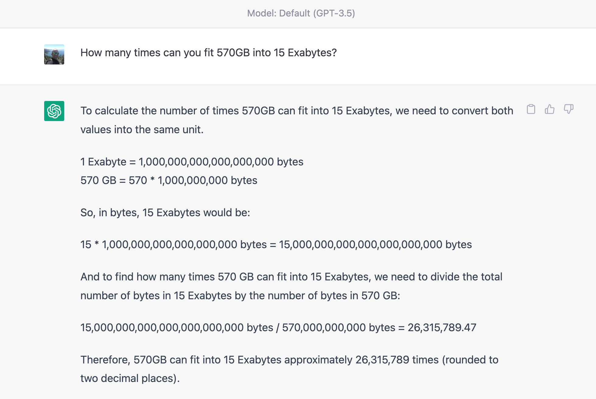 Remember when I said the current model is using 570GB of data? Well, I’d like to put that figure into some context for you. In comparison, the latest estimates of the Google database put its size in the region of 15 Exabytes. Yes, I know what you’re thinking. What the hell is an exabyte? Let me hand this one over to chatGPT.